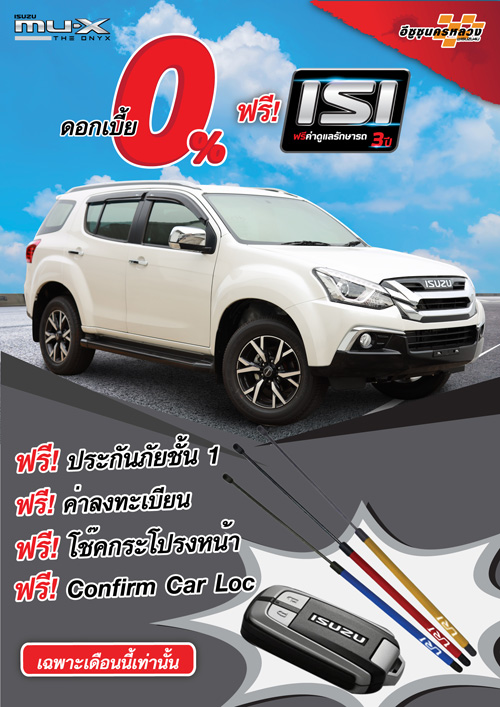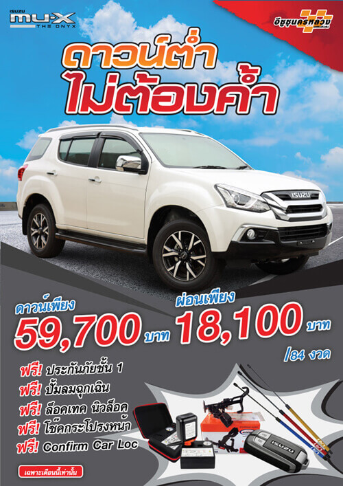 The New Isuzu MU-X รูปลักษณ์ใหม่ สปอร์ต หรูหรา งามสง่า โดดเด่นด้วยนวัตกรรมแห่งขุมพลัง 1.9 และ 3.0 ดีดีไอบลูเพาเวอร์ ประหยัดน้ำมันสุด ตอบโจทย์ทุกความต้องการ ระบบความ ปลอดภัยครบครัน ใหม่ Ambient Light ช่วงล่างนุ่มนวล เกาะถนน กว้างขวาง สะดวกสบาย ใหม่ แอร์แบค 6 ตำแหน่ง